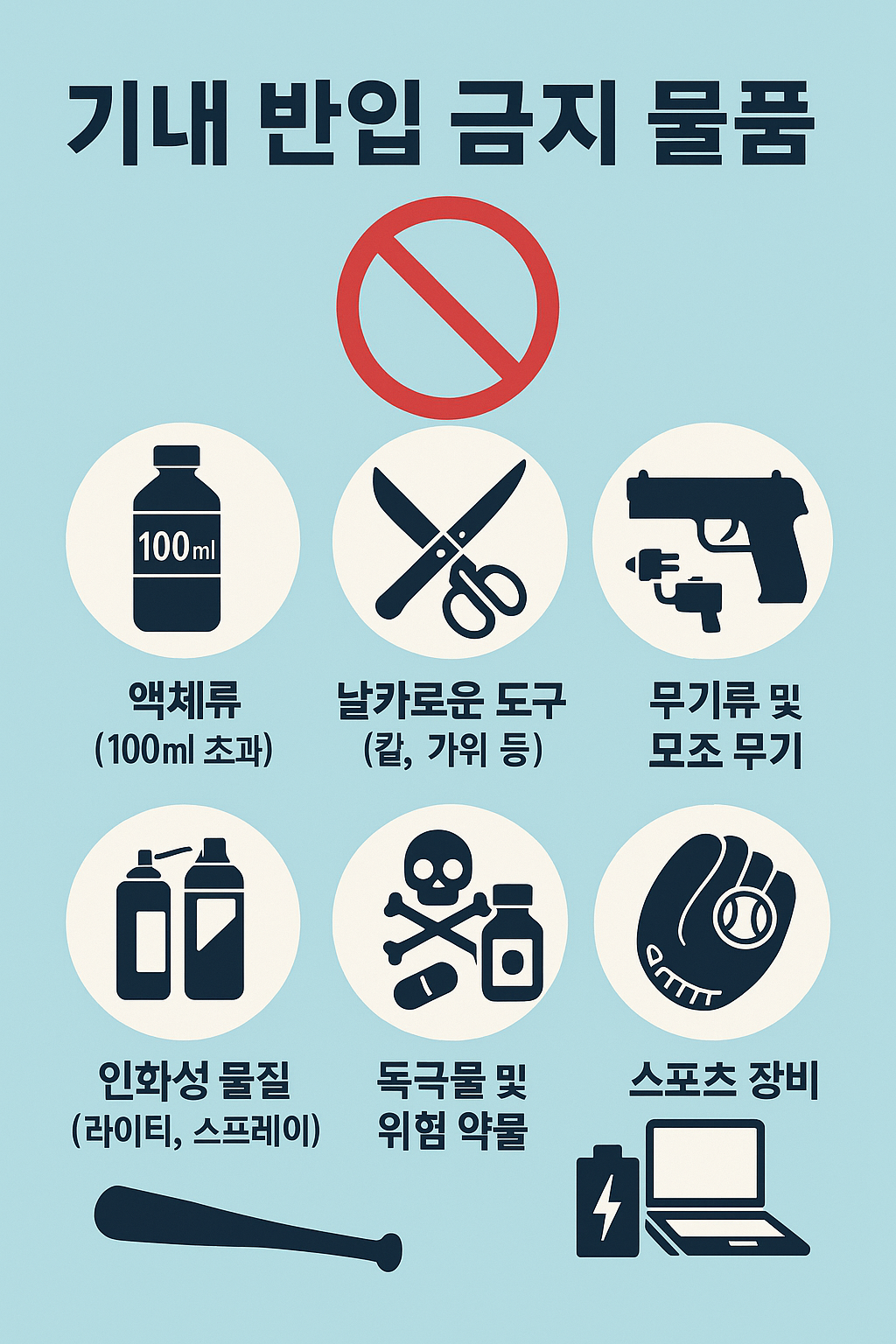 1. 액체류(100ml 초과 포함 용기 기준) ▶ 금지 이유: 액체 폭탄 제조 가능성 및 누출 위험